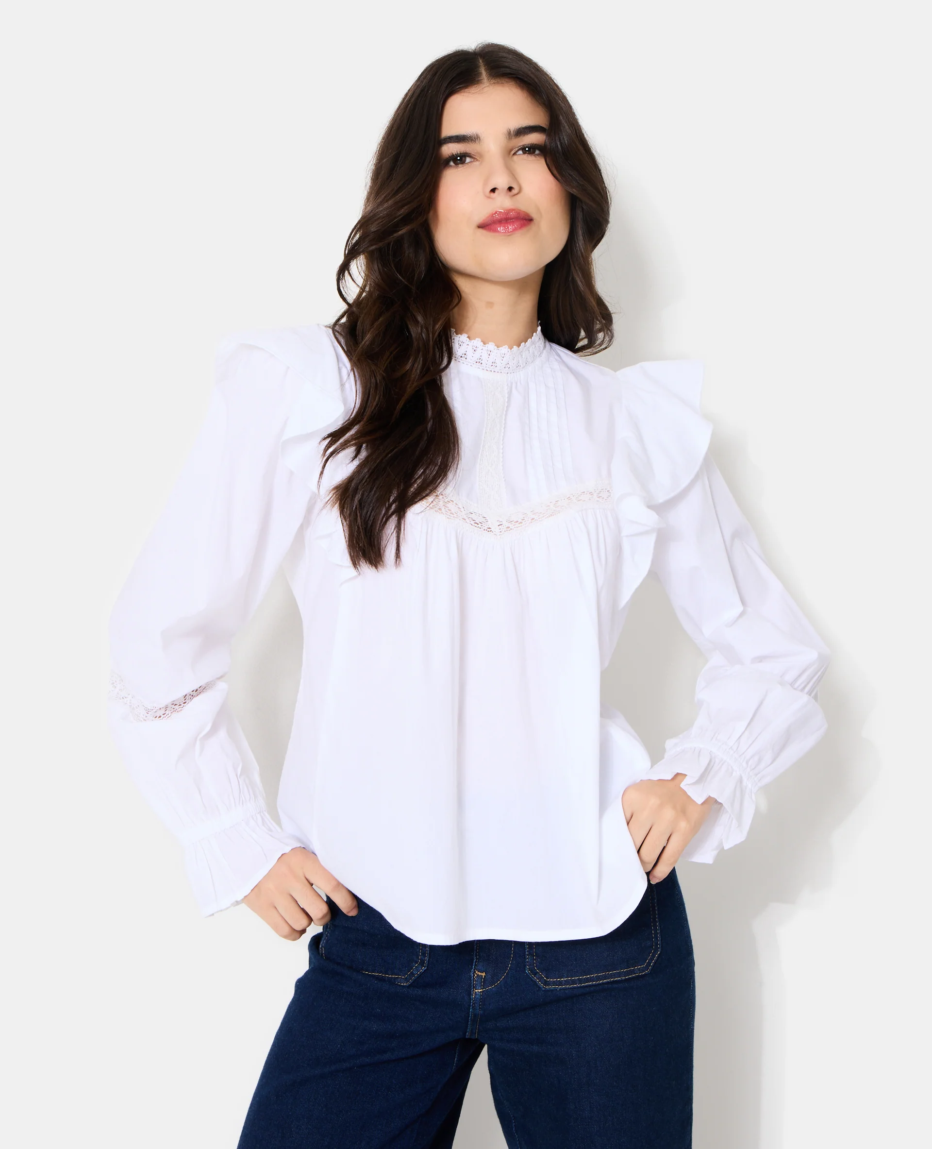 Blouse en popeline avec dentelle et volants
