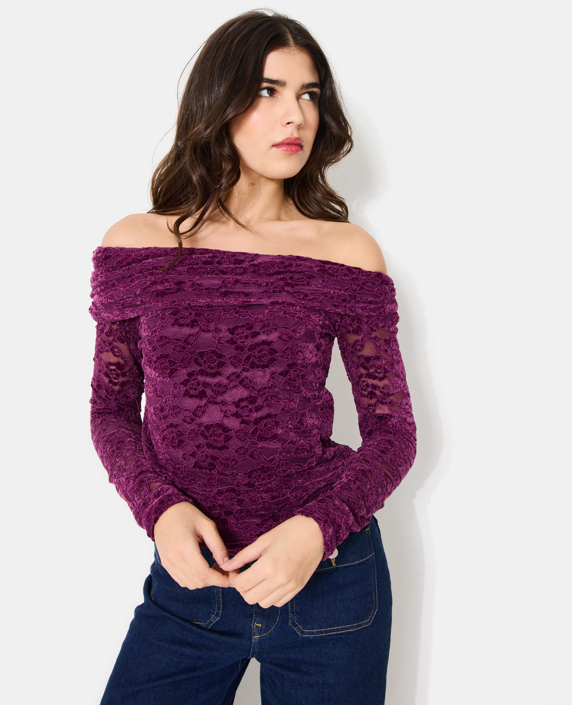 Top asymétrique en résille avec fleurs velours