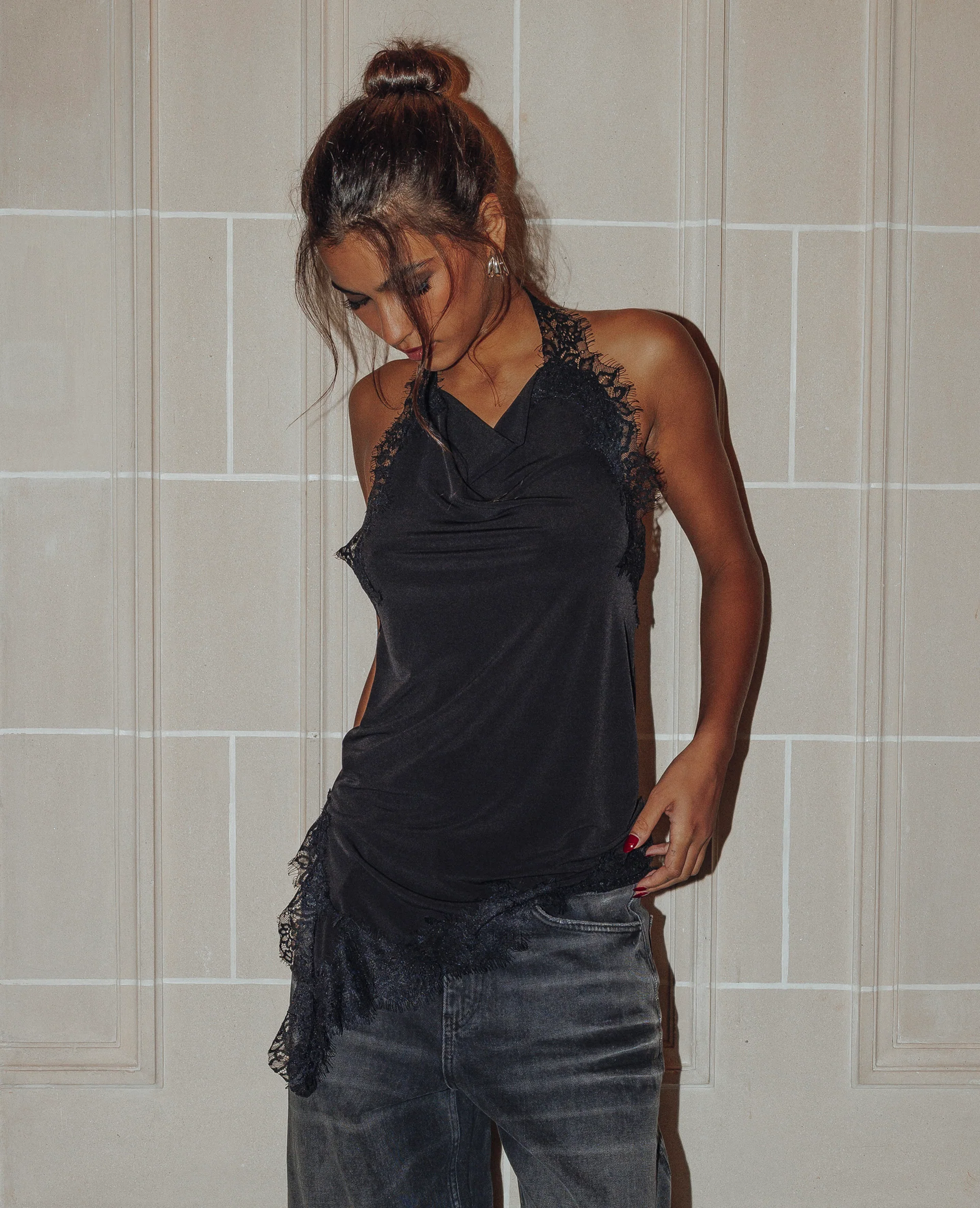Top asymétrique dos-nu avec dentelle