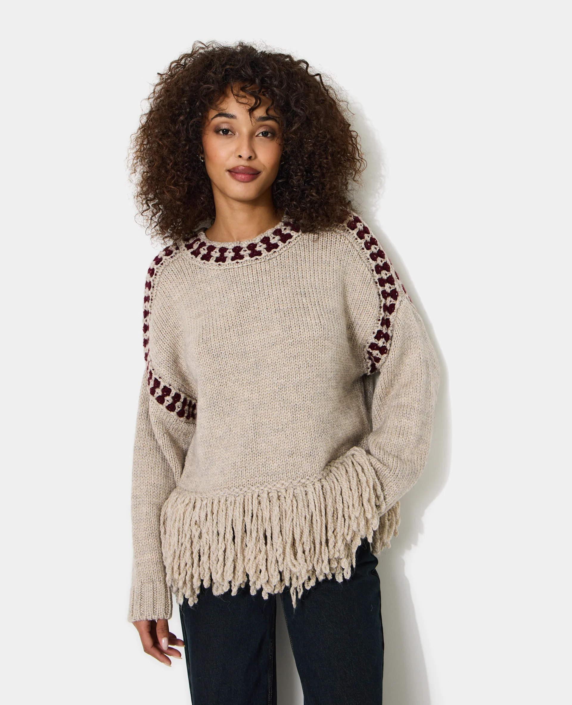Pull avec franges et détails contrastés